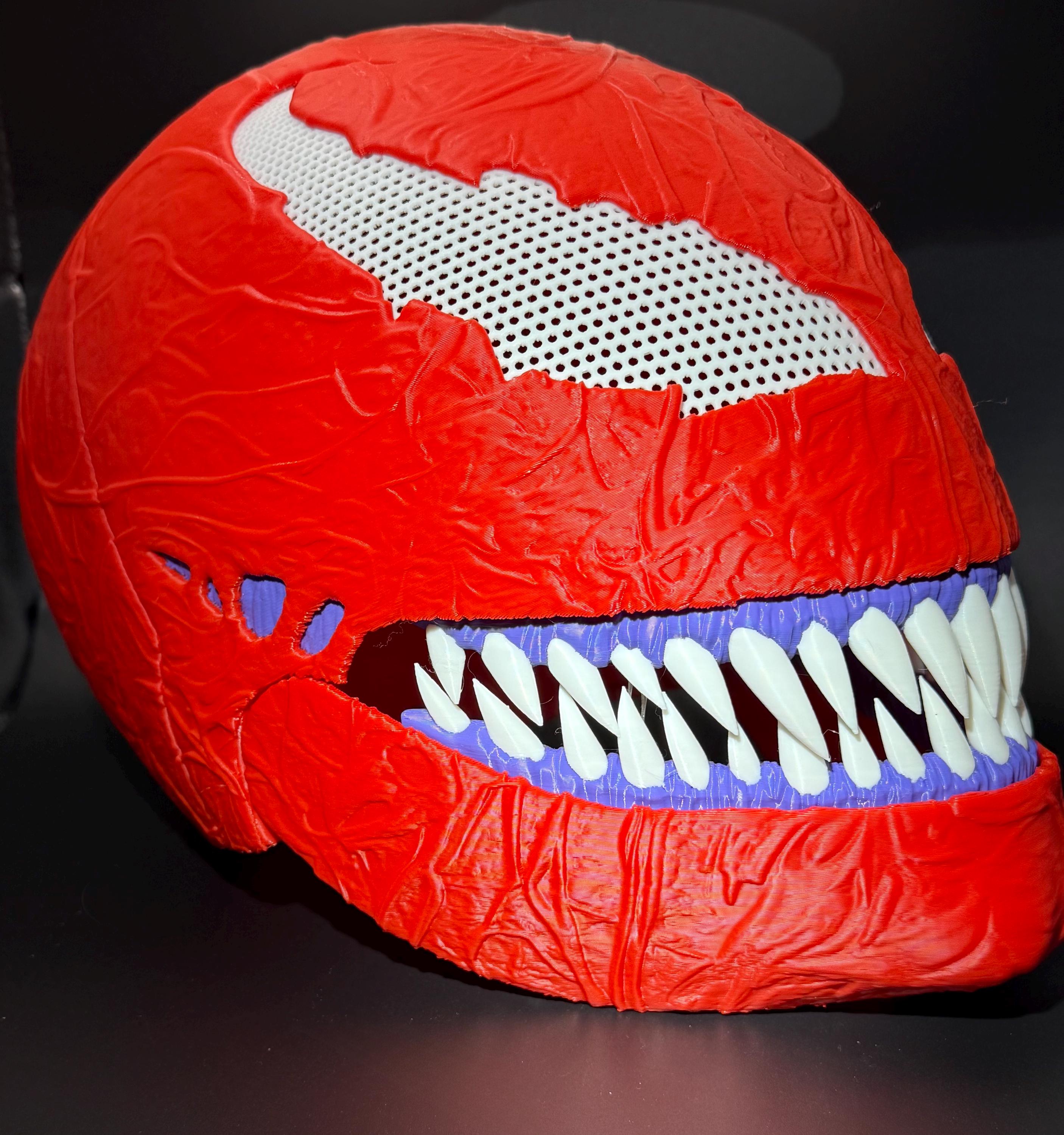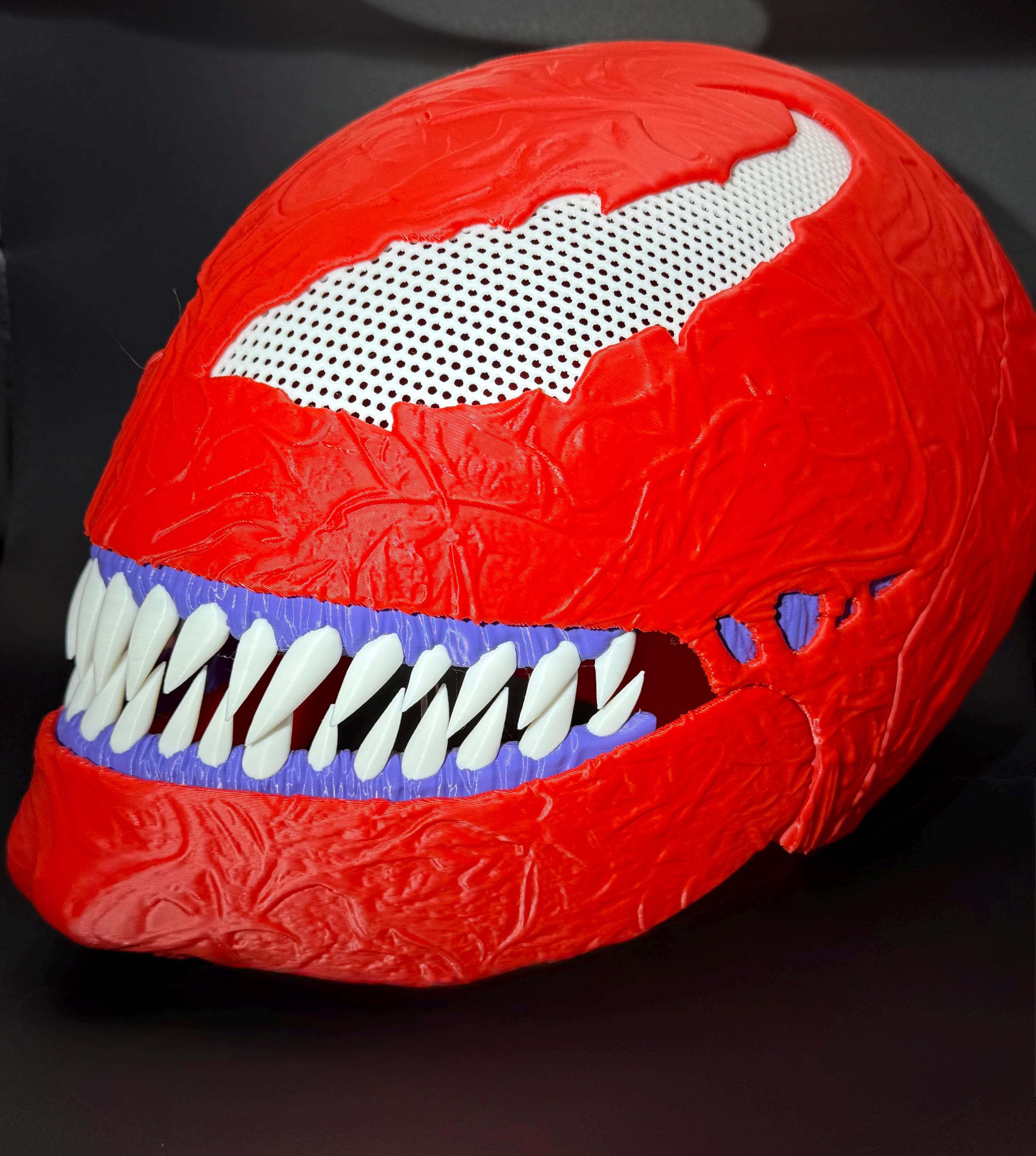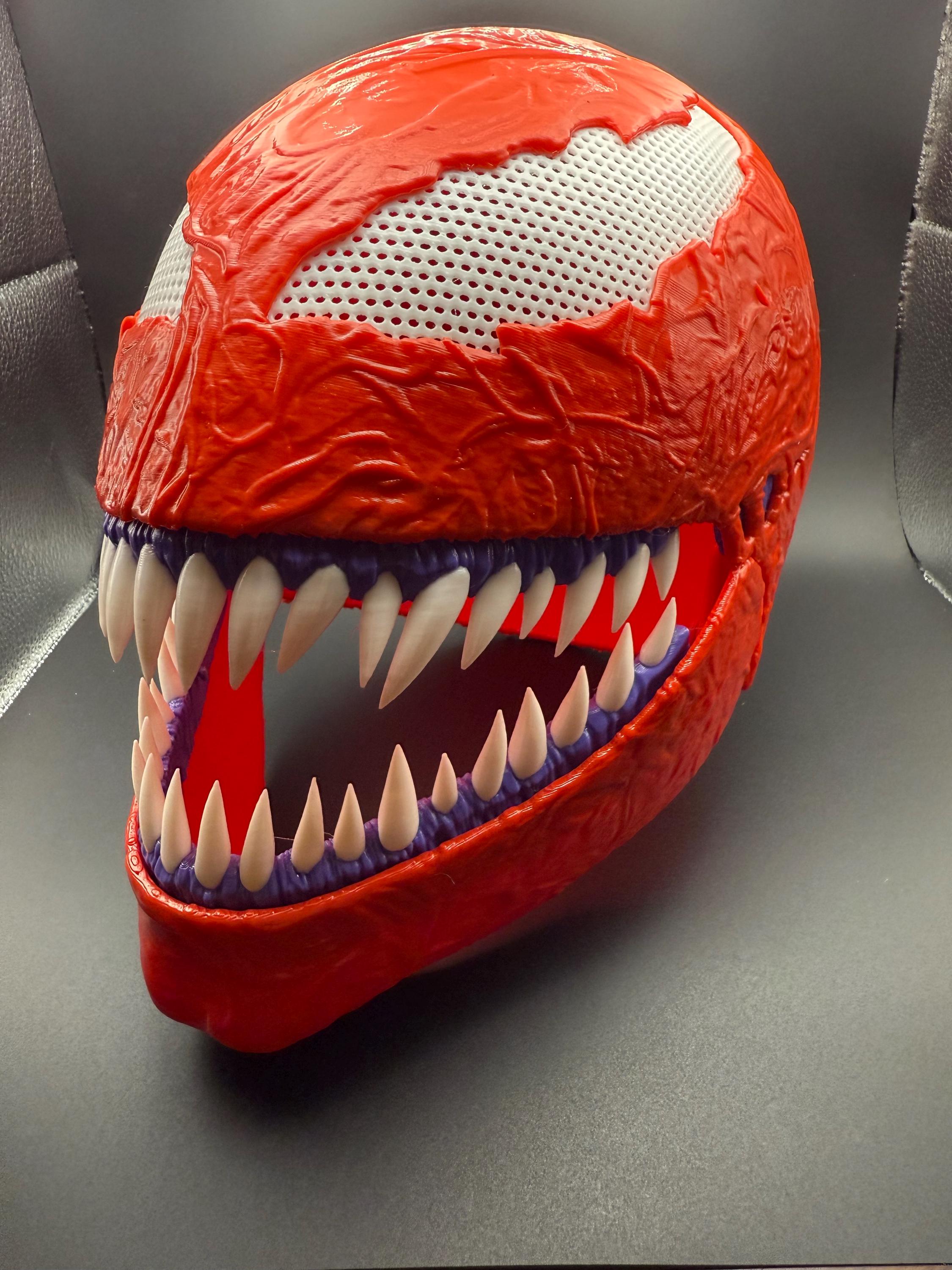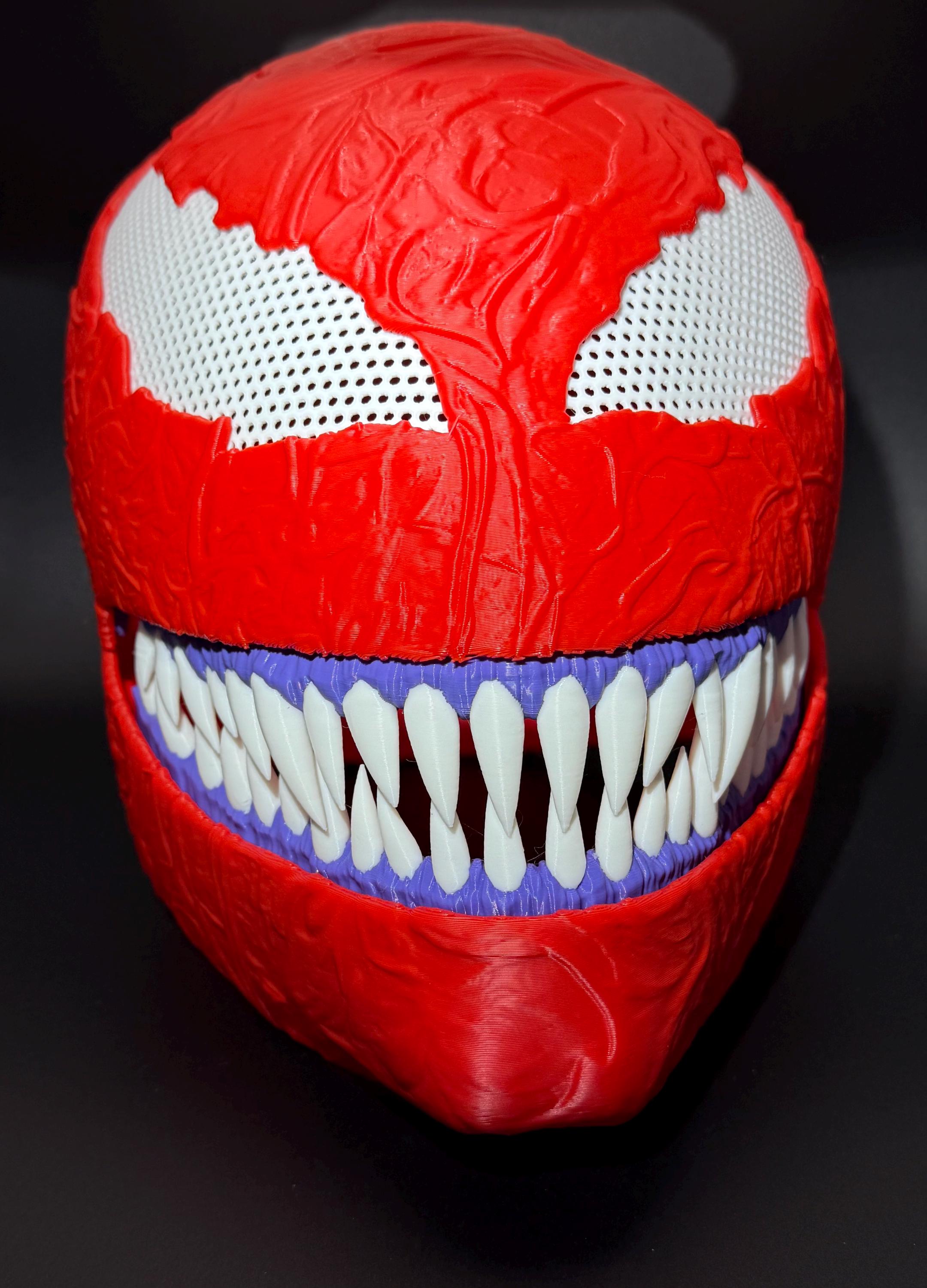 3d printed full face carnage mask with moveable jaw. the mask is finished in a high gloss clear coat. it also has a thin layer neoprene on the inside for a snugger and more comfortable fit. One standard fit mask in stock for shipping next day, all other sizing takes 1-3 days. please reach out with sizing needed so we may print the item correctly. Thank you!
