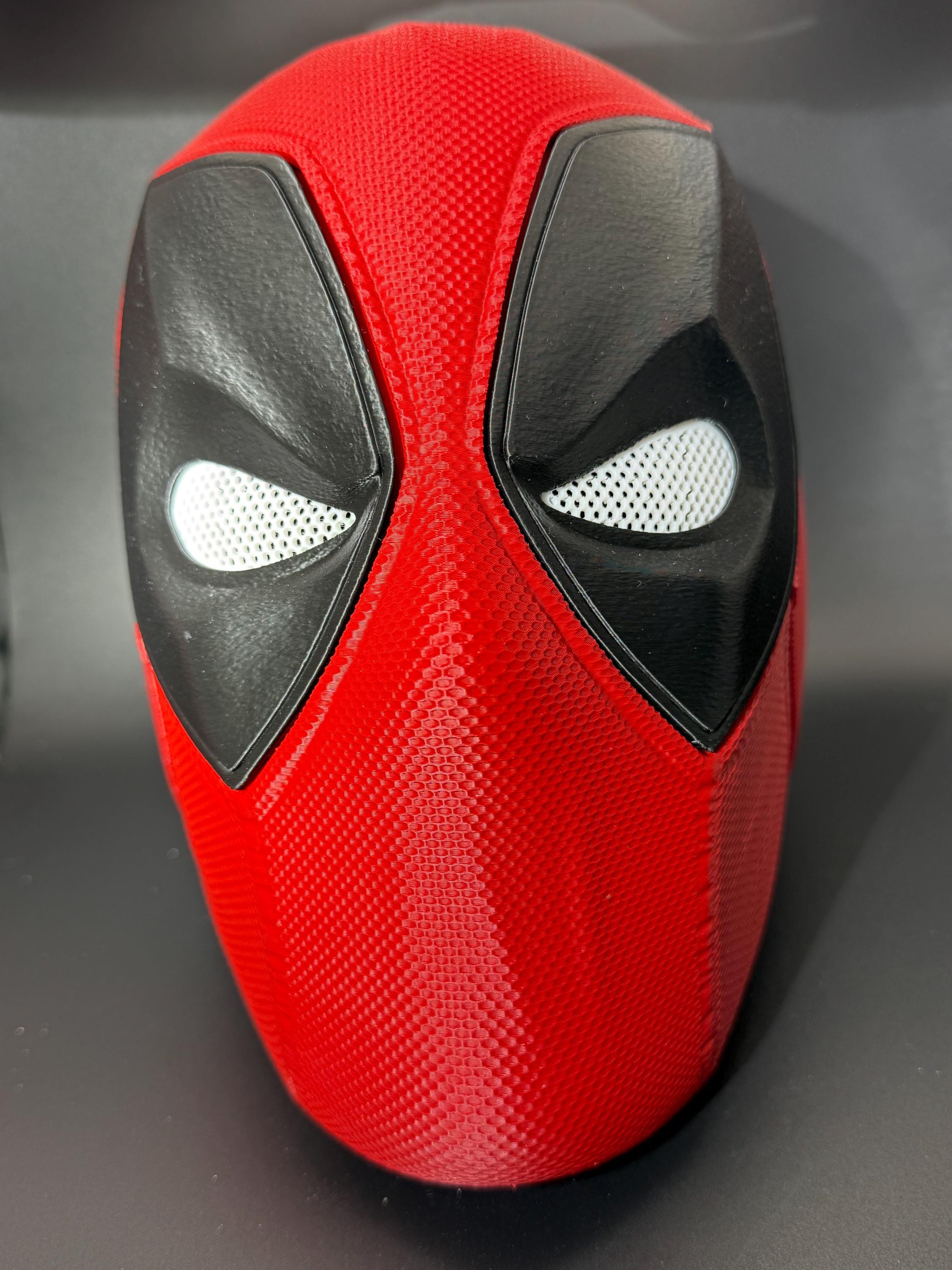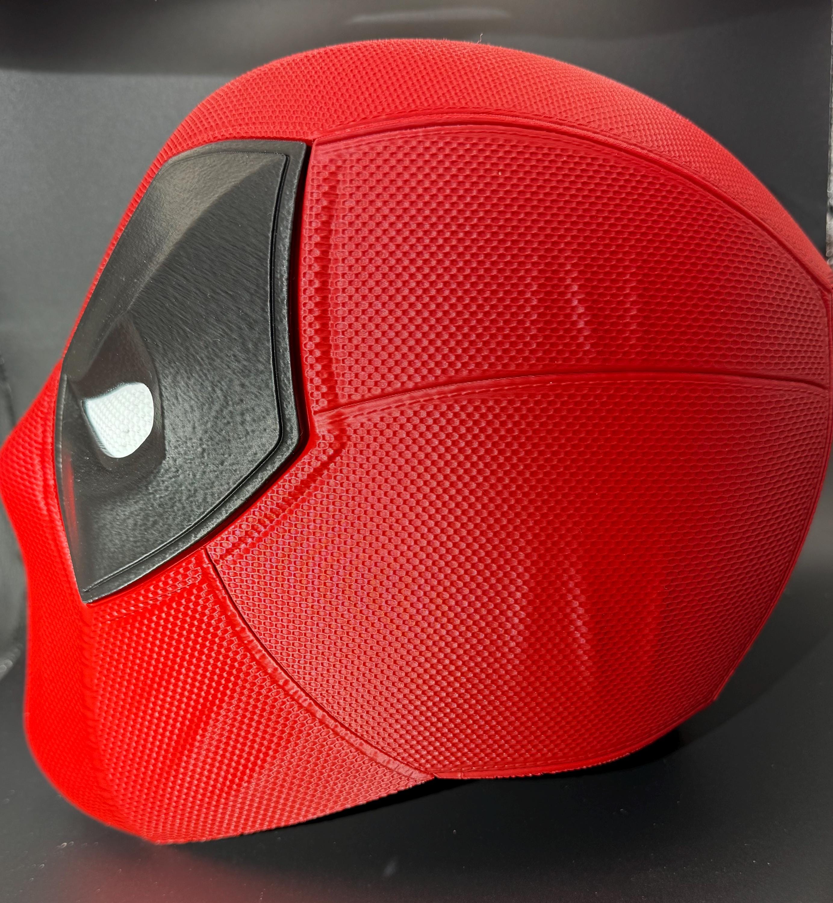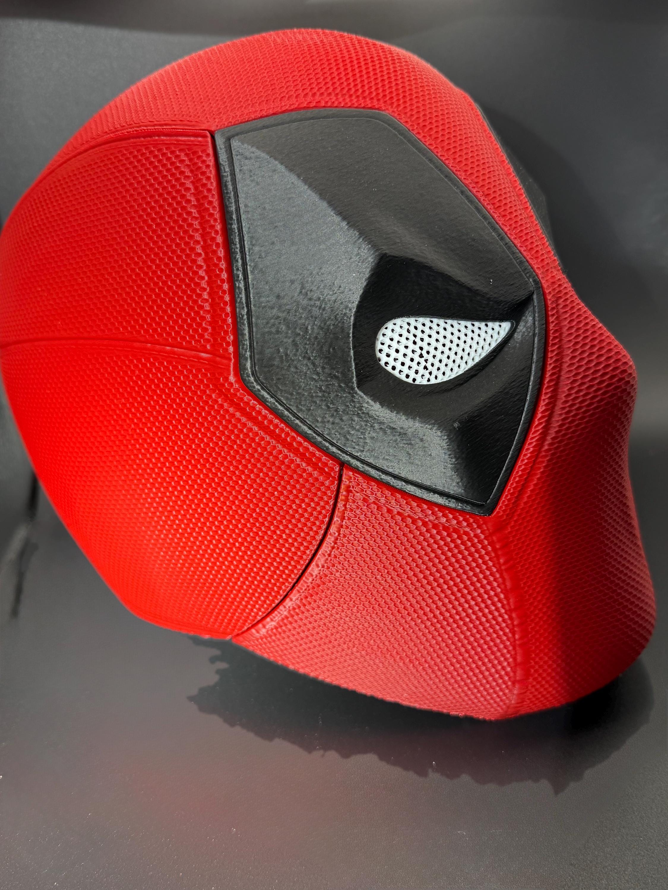 This is a 3d printed Deadpool cosplay helmet. Can be used as a decoration or worn by user. Each item is printed in a fabric-like pattern. Standard fit. This is a 3d printed item made out of PLA material and held together by magnets. There is a total of 3 panels, the face piece, and two eye pieces. Item will be shipped with the panels off, just for safety of the item. please reach out with sizing needed so we may print the item correctly. one standard fitting mask in stock for shipping next business day. all other sizes will take 1-3 days to print.