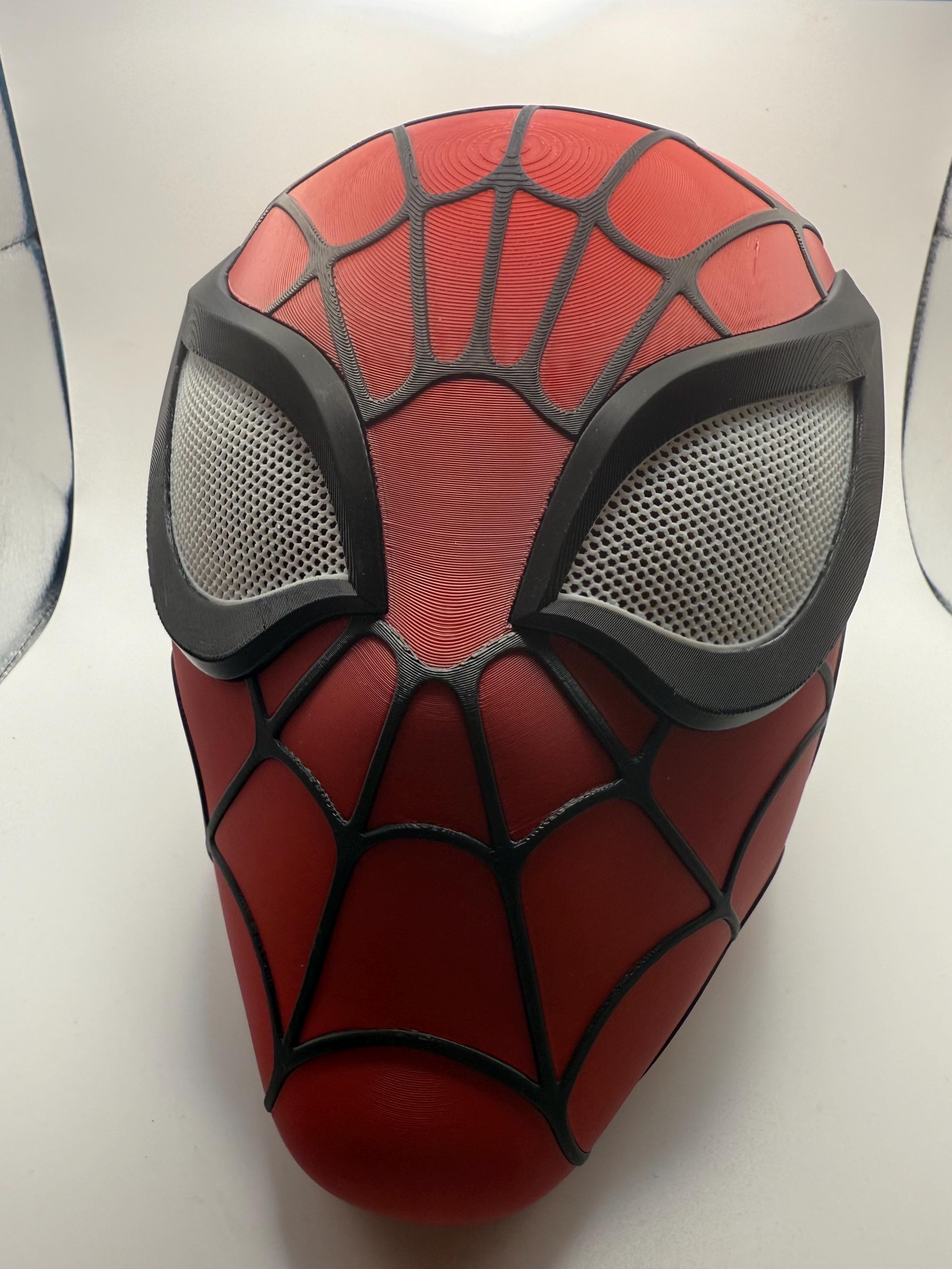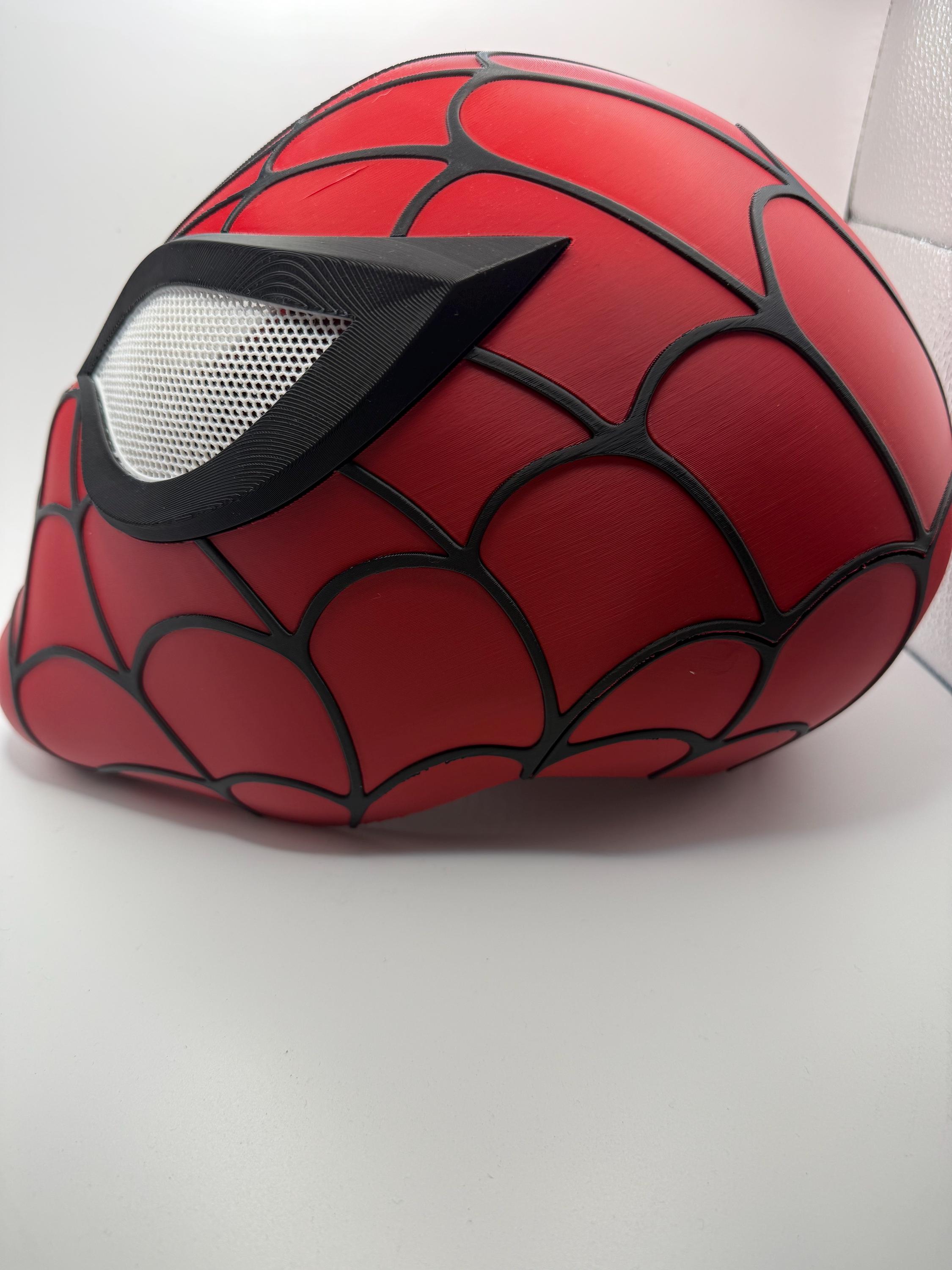 Full coverage Spider-Man helmet. Standard fit, fits most adult heads but can be scaled larger or smaller, please reach out with sizing so we can ensure the perfect fit. Come with a layer of neoprene inside for a more comfortable fit. This is a two piece helmet, a front and rear panel that uses magnets to hold together. Also has magnetic eyes. *Please remember with 3d printed items there may be small defects, but each item is inspected before shipping. If there is ever an issue please reach out. Thank you!*