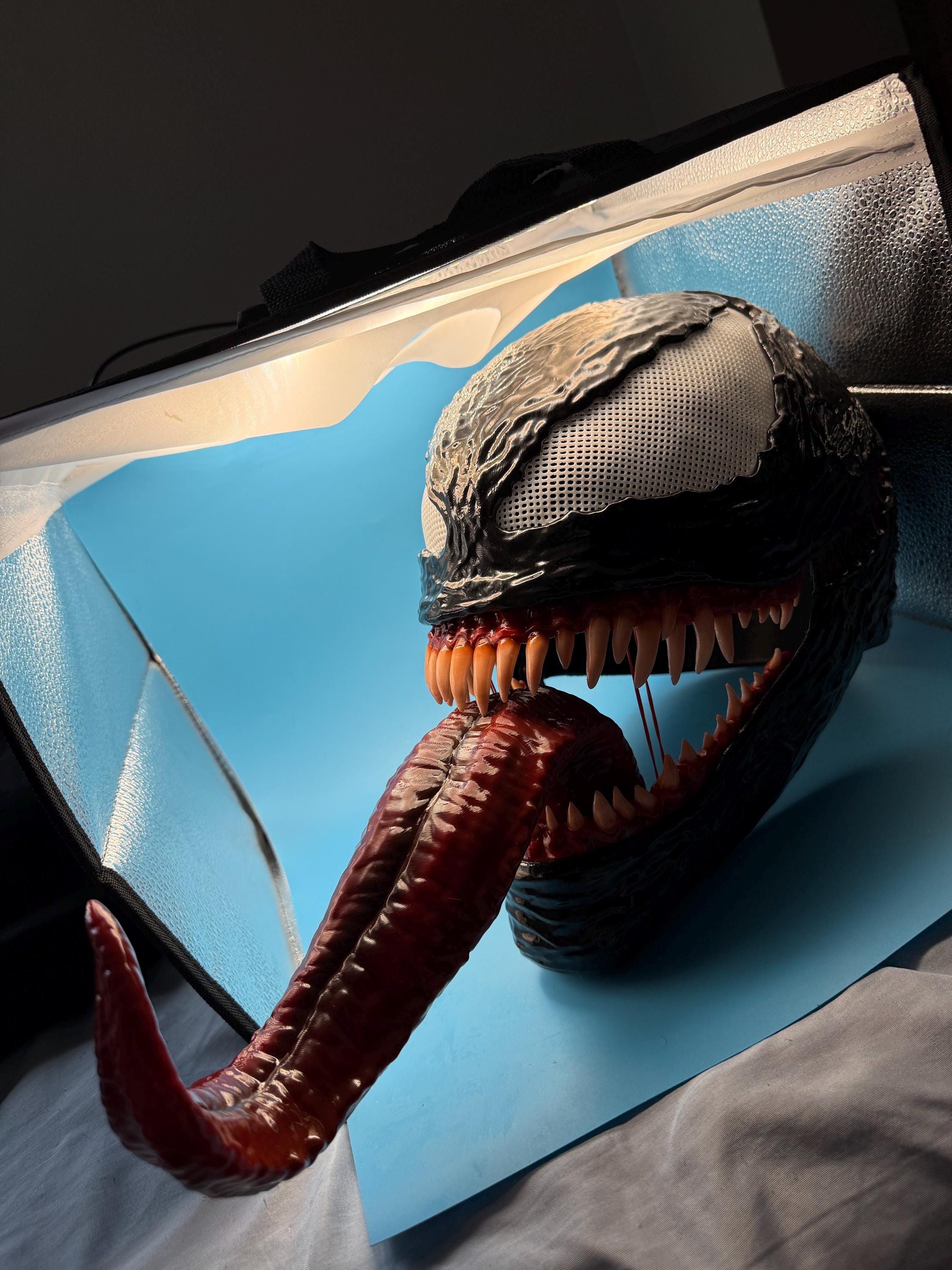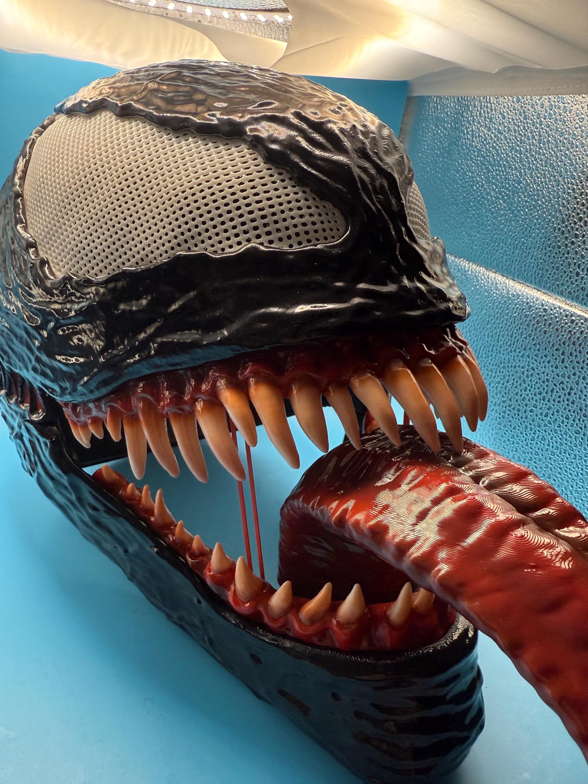 Full head venom helmet. This is 3d printed and the two panels are held together with magnets. This comes clear coated and hand airbrushed/painted. The jaw moves by using two rubber bands on either side of the mask. Standard fitting. Can be ordered with or without tongue.